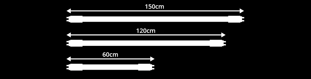 Les longueurs les plus courantes des tubes LED T8 sont 60cm, 90cm, 120cm et 150cm. Pour les tubes LED T5, il s'agit de 55cm, 85cm, 115cm et 145cm. Vous passez aux tubes LED ? Vérifiez toujours la longueur de votre tube fluorescent actuel. Lisez notre article de blog pour avoir toutes ls informations nécessaires!