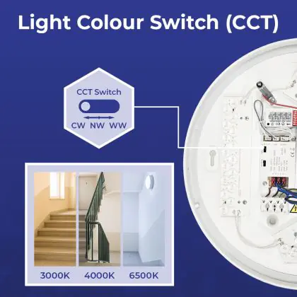 2. CCT : Vous choisissez parmi 2 ou 3 couleurs définies à l'aide d'un interrupteur, comme le blanc chaud ou le blanc froid.