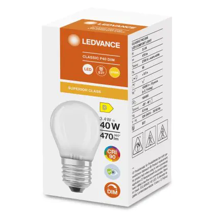 Cette ampoule Ledvance Superior Classic LED E27 Boule Dépolie 3.4W 470lm - 927 | Dimmable - Meilleur rendu de couleur est l’alternative idéale pour la remplacement de votre ampoule classique de 40 W. La technologie LED intégrée vous offrira de nombreux avantages. Les ampoules à incandescence traditionnelles ont une durée de vie limitée. Cette alternative LED vous permettra de profiter d’un éclairage durable et fiable.