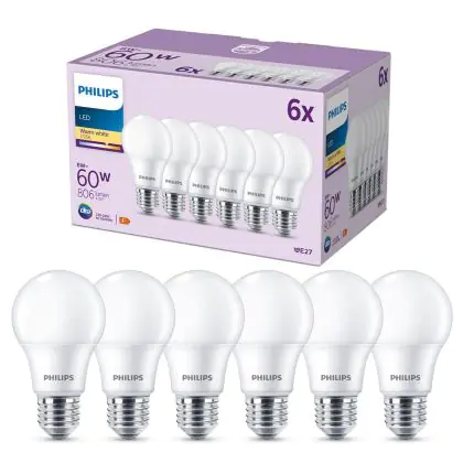 Description Lot 6x Philips Ampoule LED E27 Poire Dépolie 8W 806lm - 827