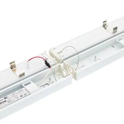 La réglette LED, Philips Réglette LED CoreLine Blanc 17W 2400lm - 865 Lumière Du Jour |60cm - - Remplacement 2x18W est conçue pour remplacer les réglettes TL-D traditionnelles et permettant d’économiser jusqu’à 50% d’énergie. Très souvent utilisé pour l’éclairage d’entrepôts, d’usines, de parking et d’autres grands espaces extérieurs. Très simple d’installation, cette réglette de peut se fixer au plafond et au mur et projette 6500K - Lumière du Jour, comme couleur de lumière. La Philips Réglette LED CoreLine Blanc 17W 2400lm - 865 Lumière Du Jour |60cm - - Remplacement 2x18W dispose d’un indice de protection IP20 à l’eau et la poussière et d’une résistance aux chocs IK04.