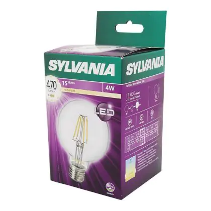 Cette ampoule Sylvania Retro ToLEDo E27 Globe 80mm Filament Claire 4W 470lm - 827 | Remplacement 40W avec son efficacité lumineuse de lumen par watt vous permettra de profiter d’un éclairage de qualité. Avec sa durée de vie de 15000 heures, vous n’aurez pas à vous soucier de son remplacement avant quelques années.